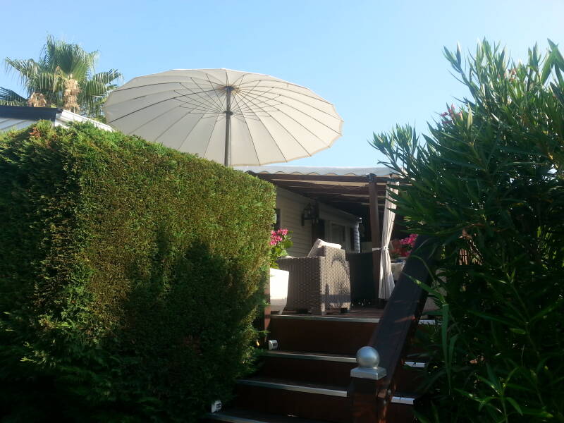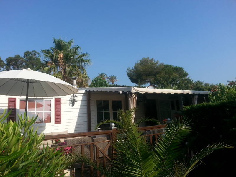 "Mobilhome Jan" is equipped with 2 bedrooms on the panoramic terrace, beautiful half covered wooden terrace, lounge set outside, partial sea view, dishwasher, washing machine, flat screen TV, radio, CD, Philips Senseo, coffee machine, microwave, oven, air conditioning, BBQ grill, hybrid car charging at the mobilhome is possible and 300 meters walk to the beach.