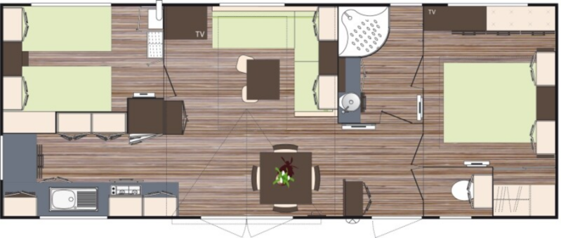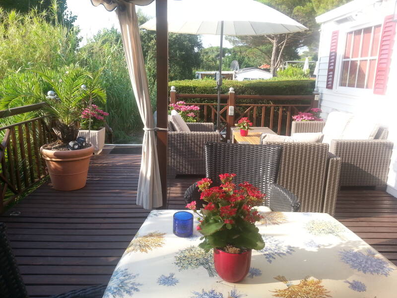 "Mobilhome Jan" è dotata di 2 camere da letto sulla terrazza panoramica, bella terrazza in legno semicoperta, salone all'esterno, vista mare parziale, lavastoviglie, lavatrice, TV a schermo piatto, radio, CD, Philips Senseo, macchina per il caffè, microonde, forno, aria condizionata, barbecue, ricarica auto ibrida alla mobilhome è possibile e 300 metri a piedi dalla spiaggia.