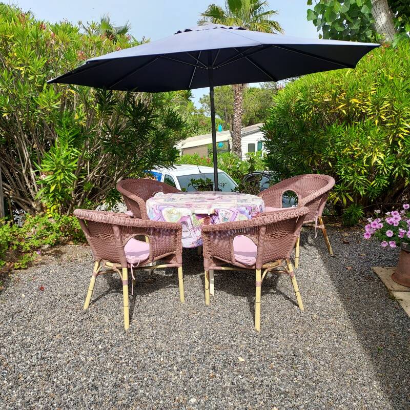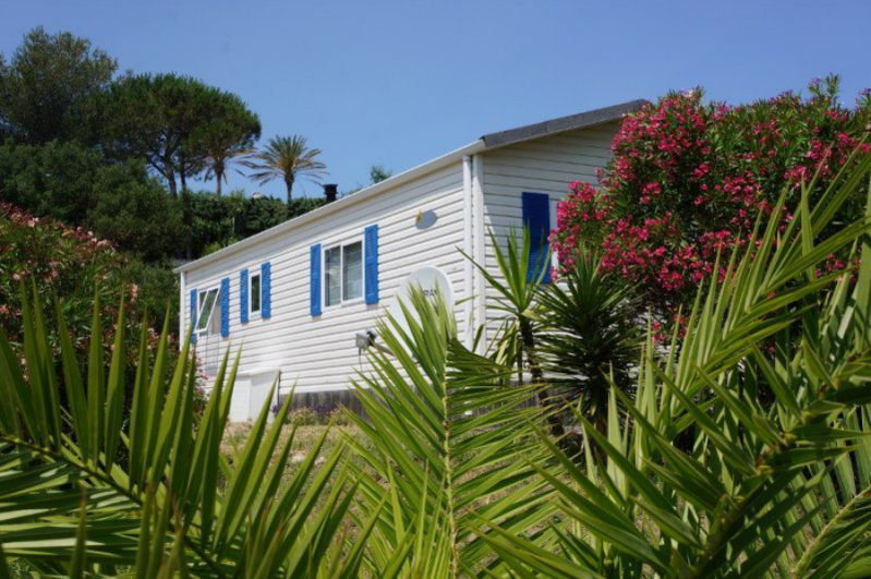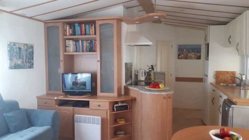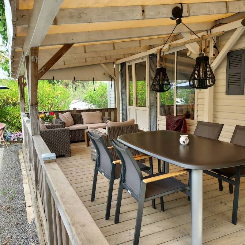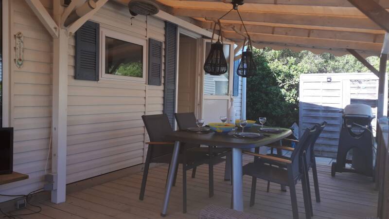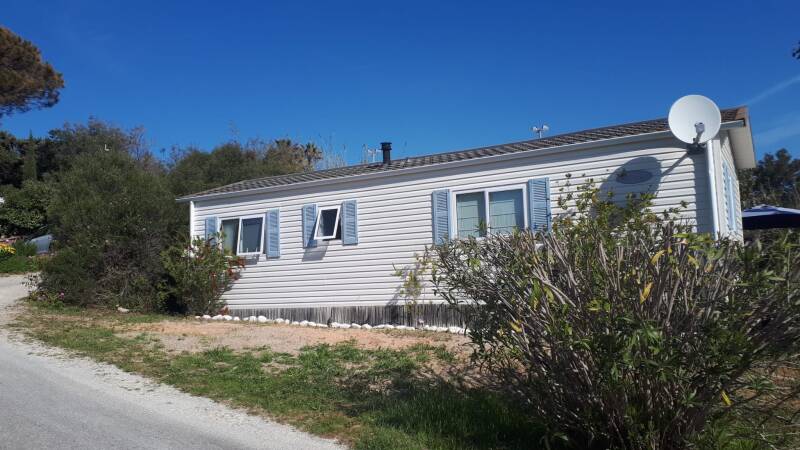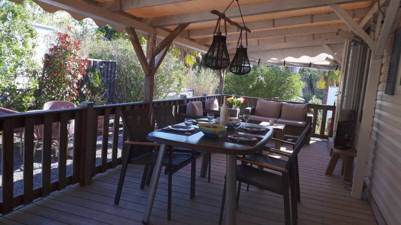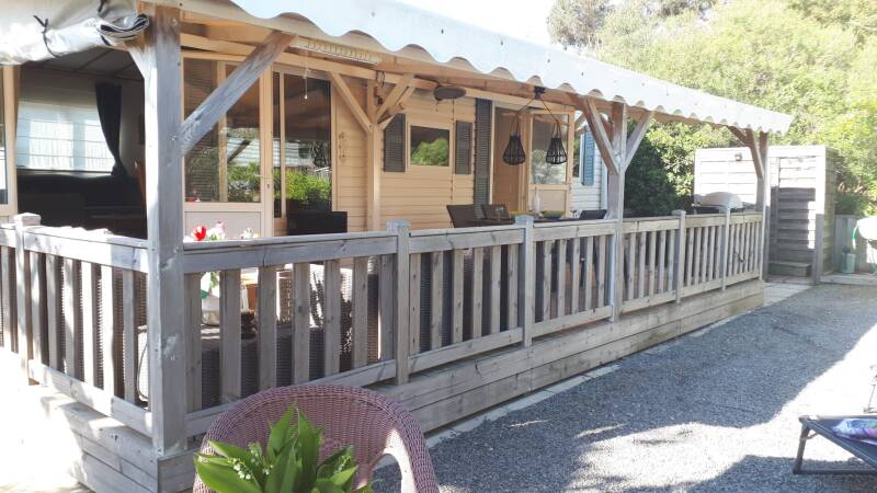 "Mobilehome Leendert" with 2 bedrooms, wide long mobile home, covered wooden terrace on the panoramique, with TV, air conditioning, outdoor and indoor shower, dishwasher, washing machine, microwave, Nespresso, coffee maker, lounge set, gas BBQ and about 300 meters from the beach.