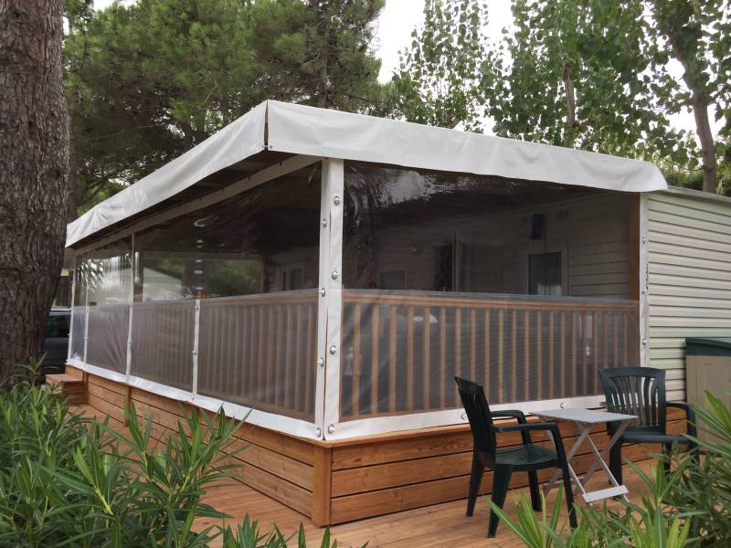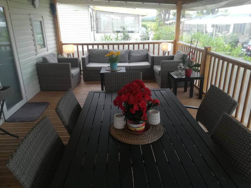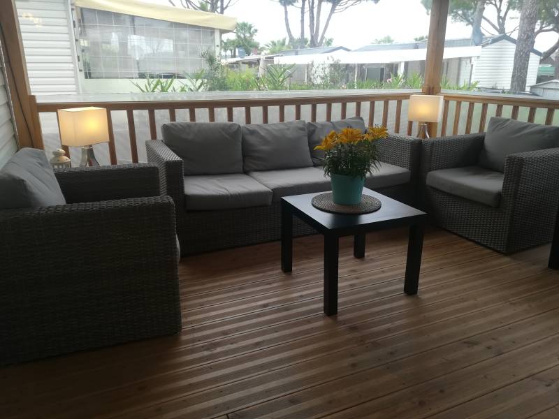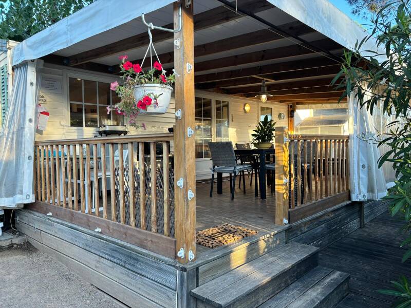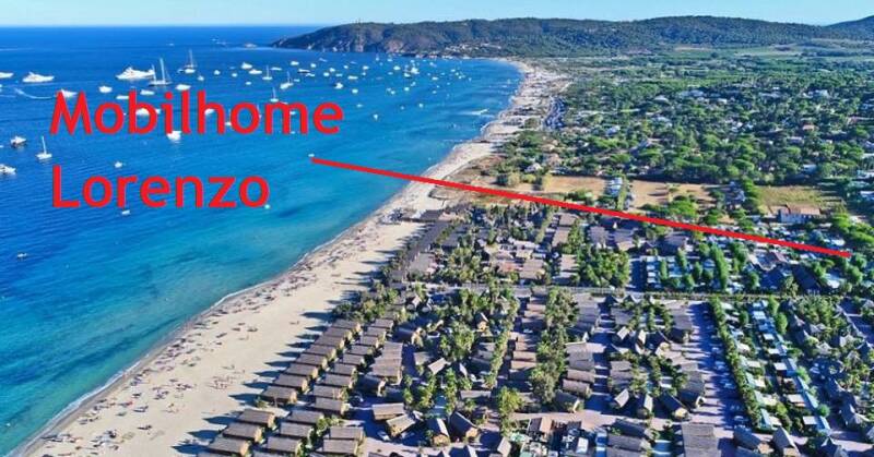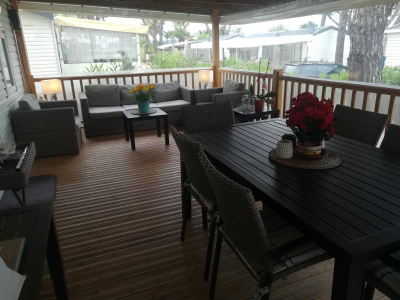 "Mobilhome Lorenzo" is voorzien van 2 slaapkamers, met groot overdekt houten terras, tv, Philips Senseo, airco, wasmachine, afwasmachine, ligbedden, loungeset, eigen parkeerplaats en ongeveer 250 meter van het strand.