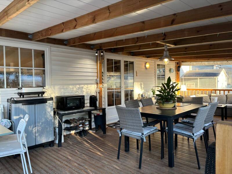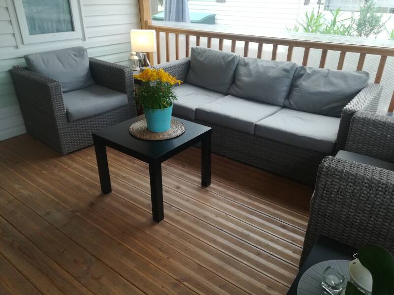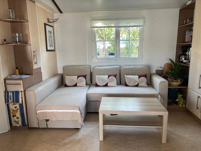 "Mobilheim Lorenzo" verfügt über 2 Schlafzimmer, met grotere überdachter Holzterrasse, TV, Philips Senseo, Klimaanlage, Waschmaschine, Geschirrspüler, Sonnenliegen, Wohnzimmerset, Privatparkplatz en ca. 250 meter vom Strand entfernt.