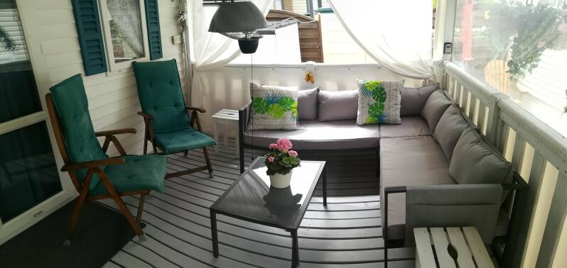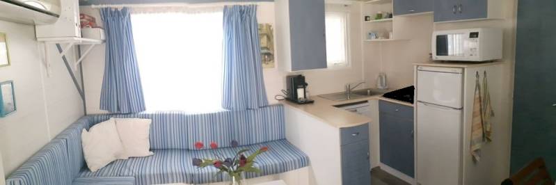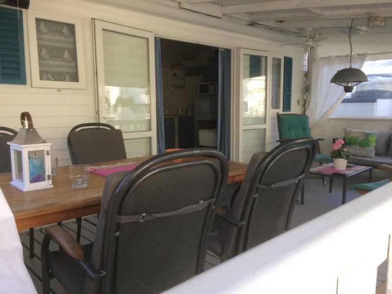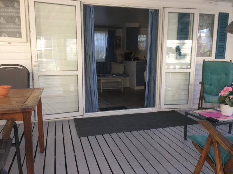 "Mobilhome Joop" has 2 bedrooms (5 beds) master bedroom with electric beds, covered heated wooden terrace (which can be closed), TV in the living room and bedroom, washing machine, dishwasher, air conditioning, radio, CD, Senseo, Nespresso, BBQ and about 200 meters from the beach.