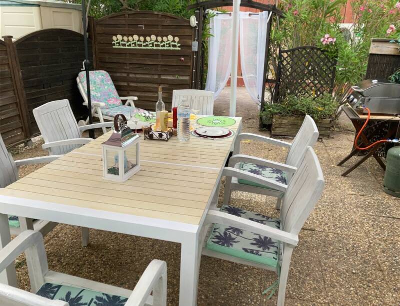 "Mobilhome Joop" is voorzien van 2 slaapkamers (5 bedden) ouderslaapkamer met elektrische bedden, overdekt verwarmd houten terras (dat afgesloten kan worden), tv in de woon en slaapkamer, wasmachine, afwasmachine, airco, radio, cd, Senseo, Nespresso, bbq en ongeveer 200 meter van het strand.